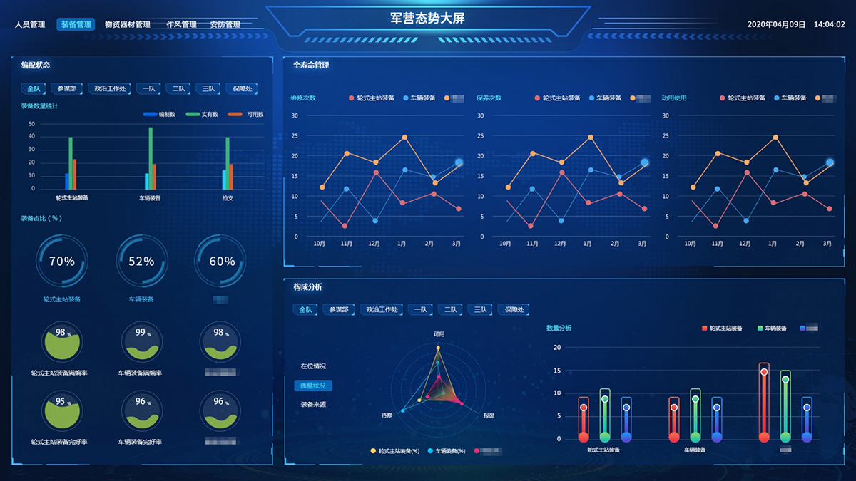 綜合保障系統依托物聯網、RFID識別和傳感技術,著眼作戰(zhàn)精準保障、戰(zhàn)備常態(tài)保障和官兵生活保障,對戰(zhàn)備物資、裝備器材、營房物資和被裝物資等的全生命周期的電子化管理,對官兵的健康實時監(jiān)護。包含財務管理、軍需油運、武器裝備、衛(wèi)勤管理、營房管理模塊。確保部隊出動,車輛給養(yǎng)油料跟得上,裝備維護情況實時掌握,營房管理工作平時與戰(zhàn)備同步推進。